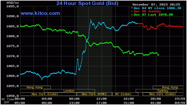 Thị trường vàng quốc tế vừa trải qua ngày biến động mạnh. Có lúc giá vọt lên mốc cao nhất trong ngày là 1.084 USD vào đầu phiên Mỹ, rồi lao dốc về 1.070 USD.
